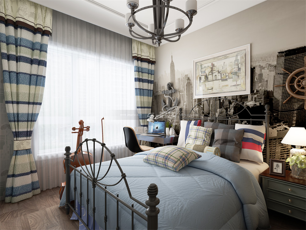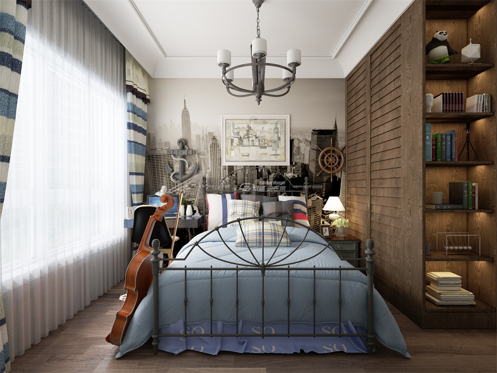 藍灰色的主題令空間更加理性與靜謐,也更符合男孩子的氣質,原木柜體帶來溫潤之感,而床、吊燈的鐵藝材質又為空間增添干練、硬朗之感,二者巧妙融合,令空間更具韻味!