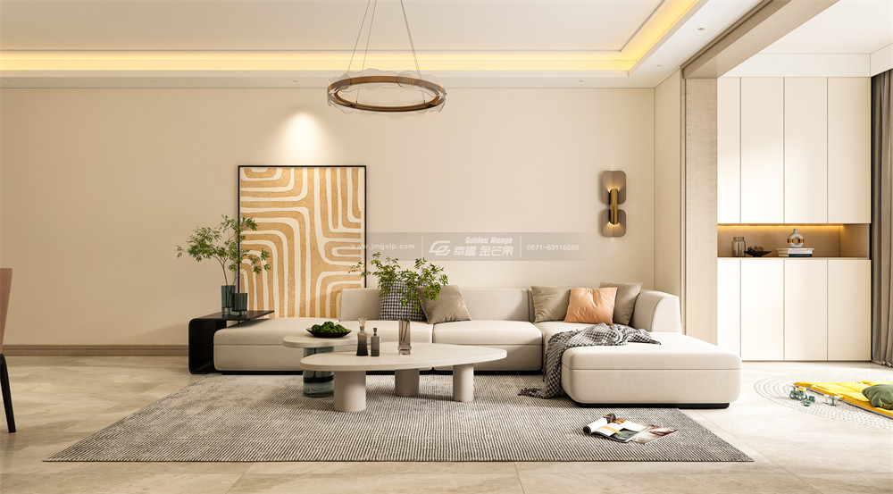 柔軟的地毯與米白色系L型沙發搭配得恰到好處,空間多了幾分輕盈與溫柔。橘色系的靠枕、裝飾畫與新鮮的綠植又為空間帶來無限的生機與活力!下班回到家,處在這樣一個唯美溫柔的空間里,一切煩惱都煙消云散了。