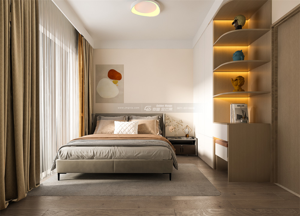次臥柜體沿著墻面定制,一墻到頂,還設計了弧形的開放格,放上喜歡的書籍或擺件,別有一番韻味,靜謐又美好,實用性也高!