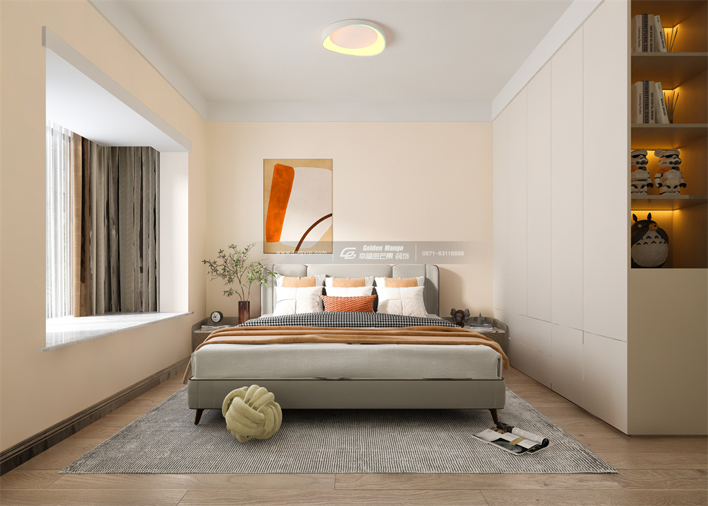 整個空間以暖色調為主,主打溫馨舒適的氛圍,右側衣柜采用一門到頂柜+開放格設計,側面設計連體開放格放置書籍或裝飾品,在充足收納空間的同時更顯精致氛圍,當清晨的第一縷陽光從左側的飄窗照射進來,美好的一天也就開始了。