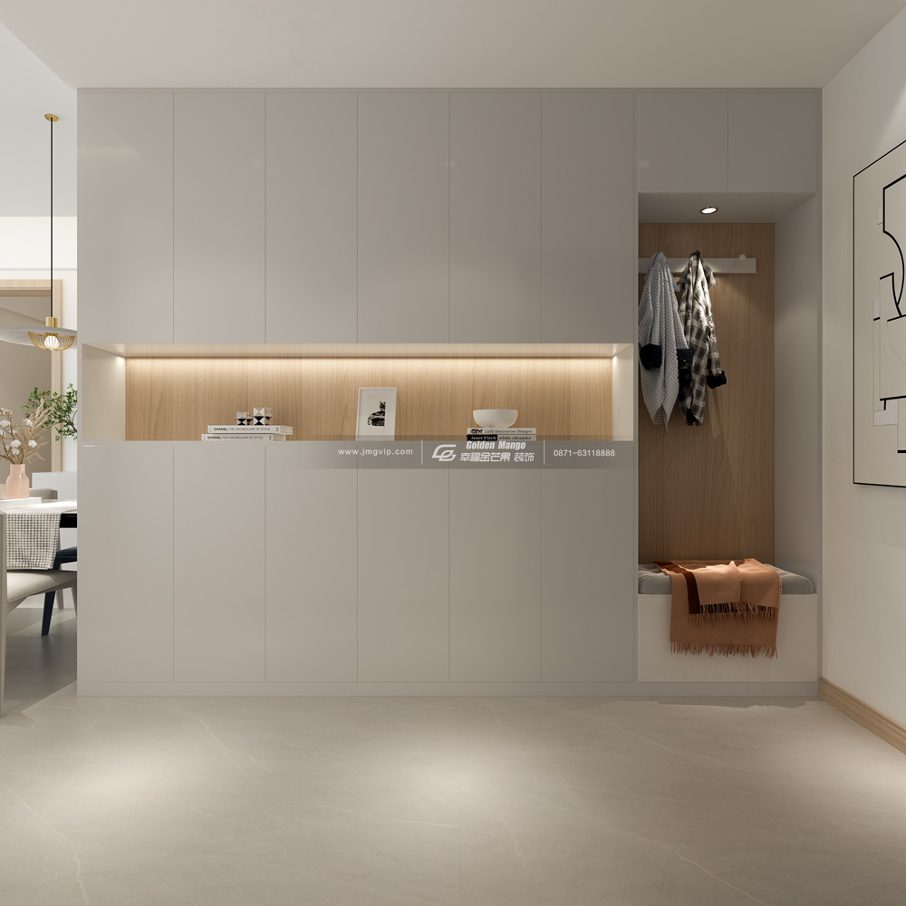 入戶設計純白色的收納柜體和線條感裝飾畫,簡約大氣;中部鏤空,方便進出門小物件的擺放,簡單的裝飾和收納,滿足居家的實際需要,簡約而靈巧的設計以精致款待美好生活。