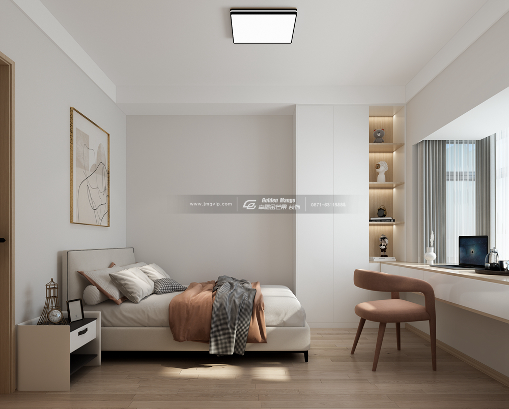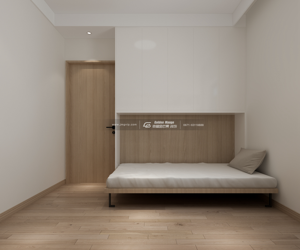 靠窗位置設置書桌和吊柜,陽光鋪滿書房,舒服而明亮,撫慰工作疲憊的身心;進門處設置可收納床體,放棄傳統榻榻米設計,閑時收起,用時放下,方便收納又不占地方,家里人多的時候還可以充當客房使用,簡直一舉多得。
