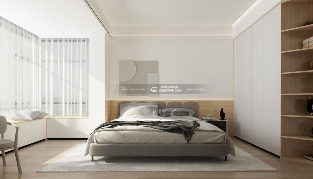 主臥以簡白色調搭配原木色地板,淡雅而清新,整個空間充滿舒適感;原木色的床頭柜和衣柜內里置物架的設計為簡白的空間增加了質感與層次,極簡中又顯現出對生活品質的追求。