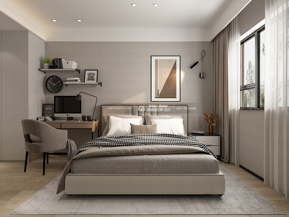 主臥整體色調清雅舒適,大面積的灰色墻壁為主調,點綴棕色的家居單品和窗簾,現代感氣質更加沉穩,讓空間看起來更加高級,不同顏色碰撞在一起帶來不一樣的視覺享受。