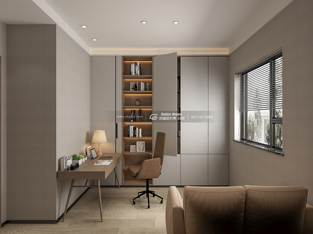 書房簡白打底,原木色和棕色的家具點綴其中;放棄傳統吸頂燈,采用無主燈設計,以小射燈、內嵌式燈帶和臺燈營造工作氛圍,閑時于此慢品人間煙火,坐觀萬事歲月,繁華三千,可待一杯香茗。