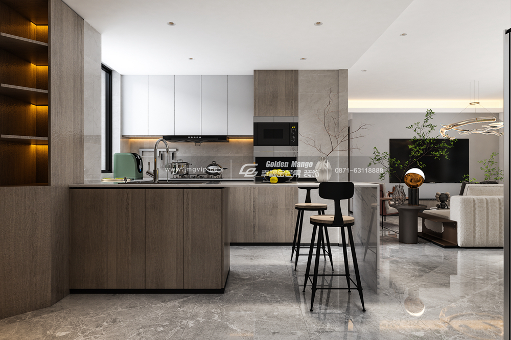半開(kāi)放式廚房設(shè)計(jì)提高了廚房的采光與家居互動(dòng)性,延伸廚房空間,吧臺(tái)與洗菜區(qū)相連,既起到劃分空間的作用,又增加了廚房可操作區(qū)域,下班后在吧臺(tái)小酌一杯或吃點(diǎn)宵夜,釋放一天的疲勞,享受美好瞬間。