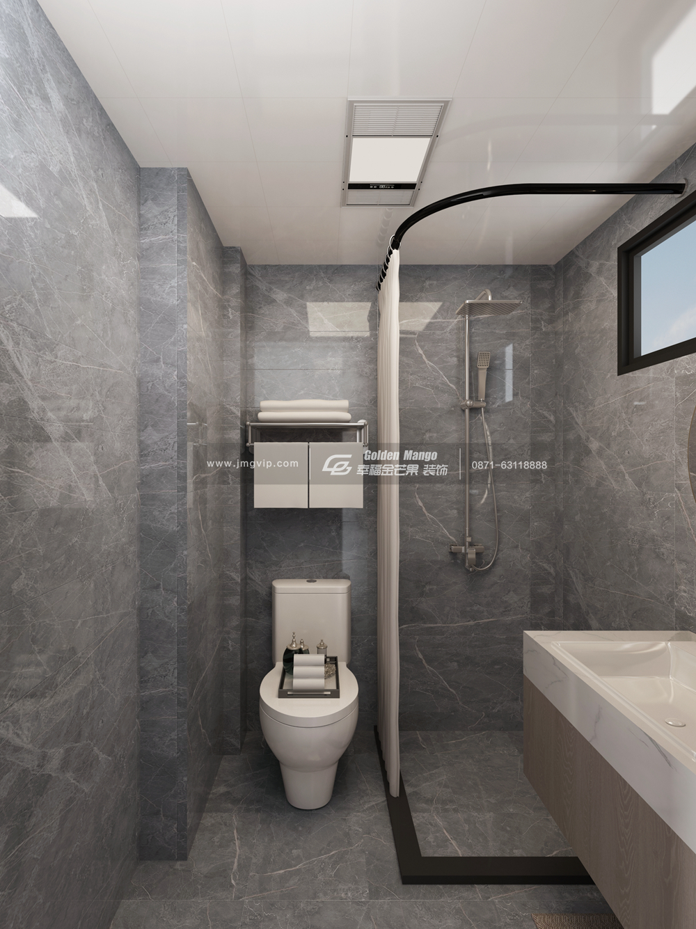 次衛與主衛一樣通鋪灰色大理石瓷磚,耐看高級又耐臟;洗衣機放衛生間,洗衣動線最短,省時省事,同時裝修時硬裝也更加輕松,進水、排水、防水易處理。