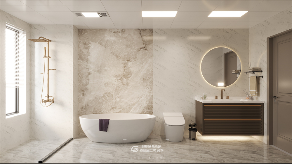 天然的大理石紋路作為背景,讓白色瞬間鮮活起來。金屬的點綴高級優雅,浴缸的線條柔和得不可思議。干凈、簡約,但絲毫不簡單。