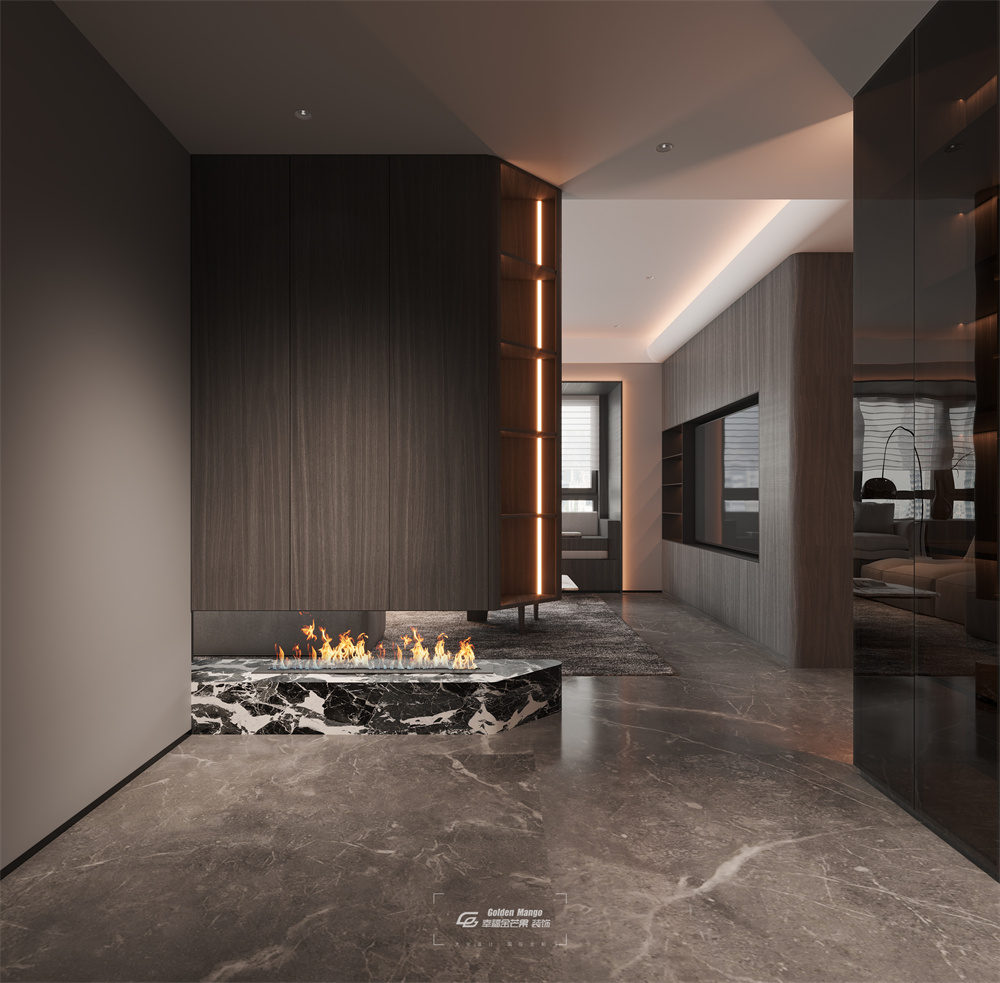 黑色的大理石躍動(dòng)溫暖的火焰,整個(gè)空間彌漫著溫馨和慵懶,隨手拿起一本書籍,空間又立馬變身氛圍感書吧,木香氣和書香氣混合進(jìn)入鼻尖,整個(gè)空間彌漫著愜意。