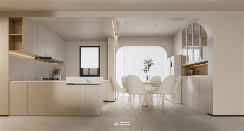 餐廚區(qū)墻頂同色,櫥柜餐桌椅選用了與客餐廳一樣的奶油色系,在視覺上放大了空間。在空間中大量運(yùn)用曲面的墻體,增強(qiáng)空間的趣味性。