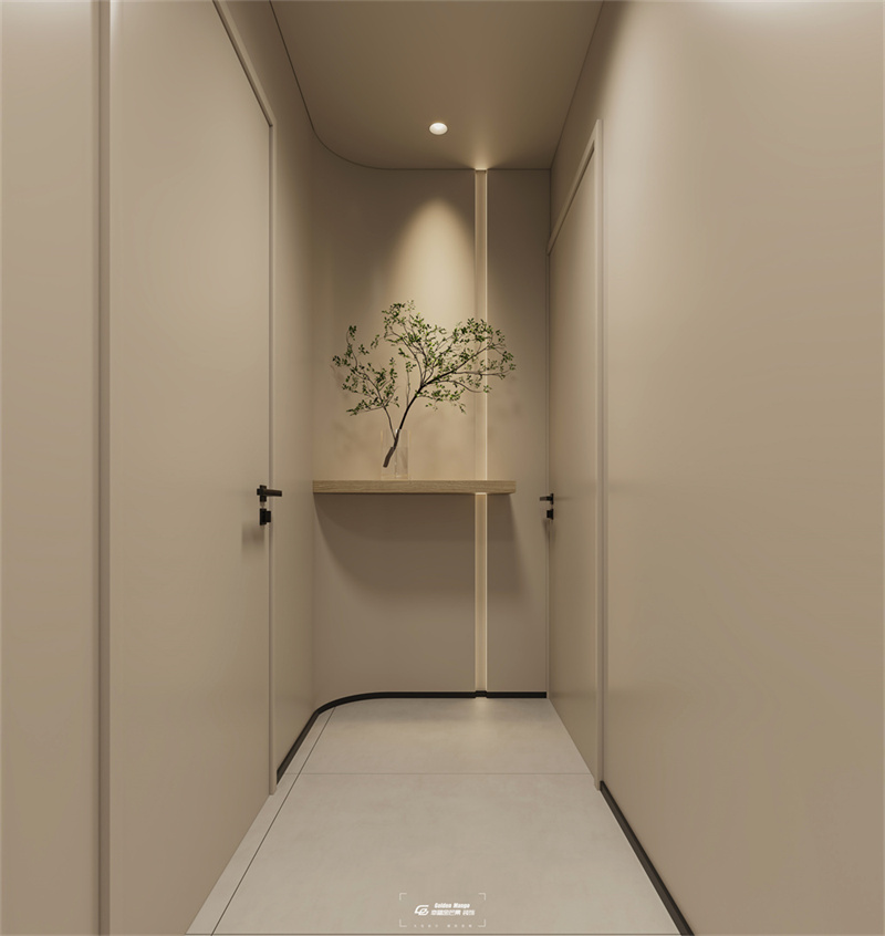 玄關(guān)處用流暢的曲線一筆鋪敘,統(tǒng)一的色彩運(yùn)用像一幅畫作緩緩鋪開來,鋪墊著即將要進(jìn)入房間的溫柔情緒。