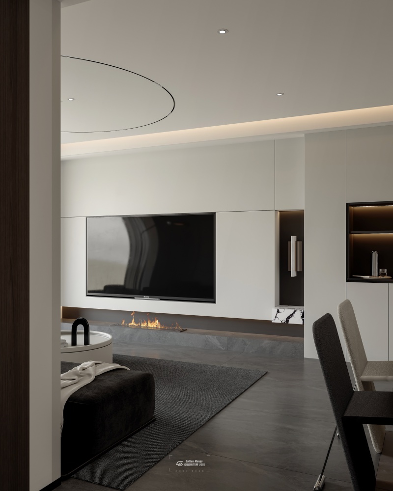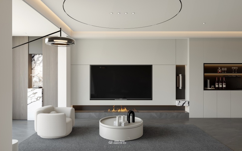 整體簡約規整,大白墻嵌入巨幕電視,下方嵌入式壁爐添溫馨。一旁柜體結合開放與封閉收納,陳列酒杯、酒瓶等,兼具實用與裝飾。白色單人沙發呼應風格,天花板圓形線條延續空間設計語言,營造簡潔大氣且有生活感的環境。