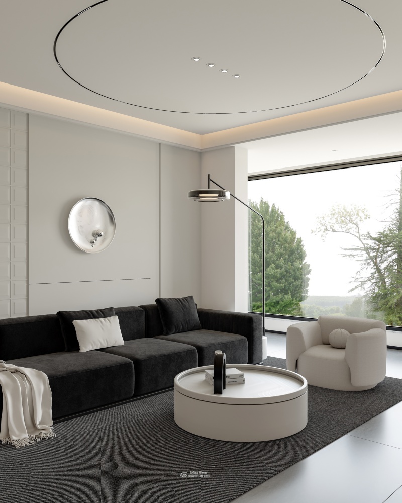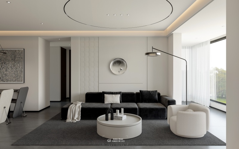 以黑白灰為主色調,簡潔大方。黑色 L 型沙發搭配淺色抱枕、毛毯,柔和空間。圓形白色茶幾造型簡約,上方小擺件增添精致感。
