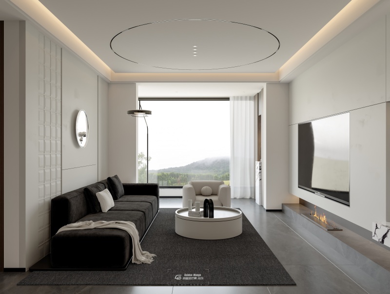 天花板的圓形線條與嵌入式筒燈、線性燈帶結合,豐富空間層次又顯精致??蛷d區域,大白墻嵌入巨幕電視,下方嵌入式壁爐增添溫馨感,旁側開放柜體陳列物品,兼具收納與裝飾。