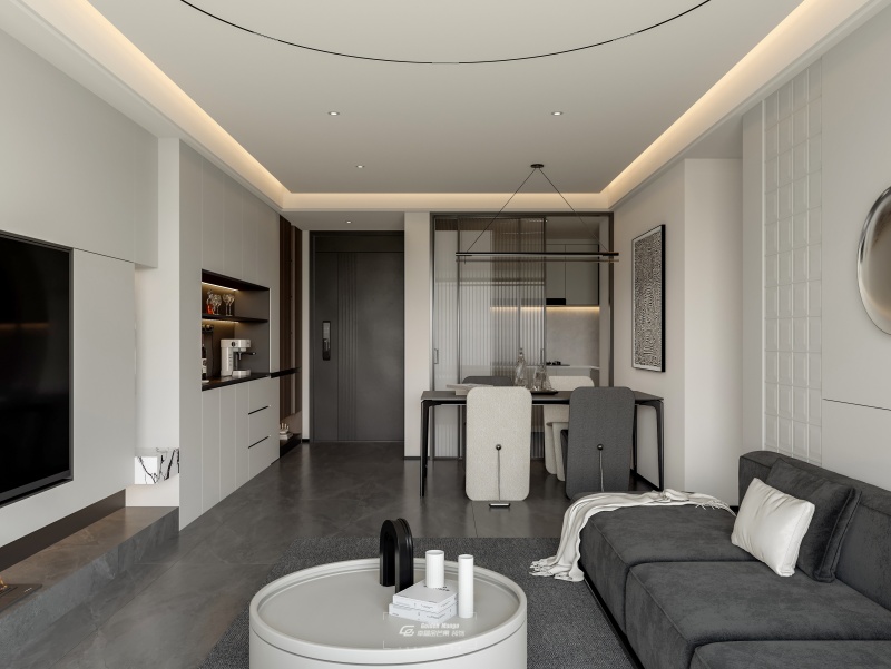 客餐廳一體化設計,流暢開闊??蛷d深灰沙發配淺色抱枕、毛毯,圓形茶幾實用美觀。餐廳區域桌椅簡約,一旁柜體有開放儲物區,擺放咖啡具等,滿足收納與展示。天花板圓形線條貫穿,增強空間整體感,營造簡約時尚的生活場景。