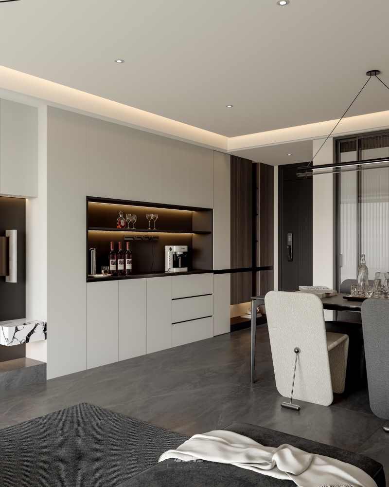 餐廳區域,簡約餐桌搭配造型獨特的灰白椅子,線條利落。天花板線性燈帶與筒燈結合,柔和照亮空間。地面深灰地磚與淺灰地毯呼應,整體設計通過簡潔布局、精致細節,詮釋出現代簡約風格的時尚與實用 。