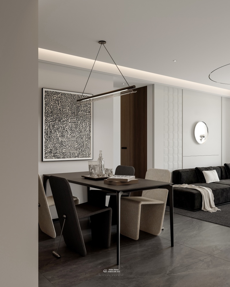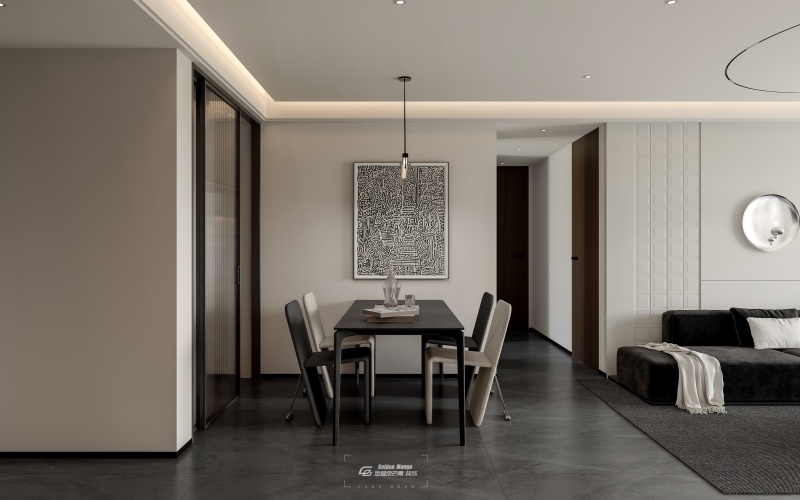 色調沉穩,深灰餐桌搭配黑白椅子,簡潔利落。上方單盞吊燈簡約現代,墻面大幅藝術畫豐富視覺。一側推拉門節省空間,另一側可看到客廳部分區域,空間過渡自然,營造出簡約又具藝術氛圍的用餐環境。