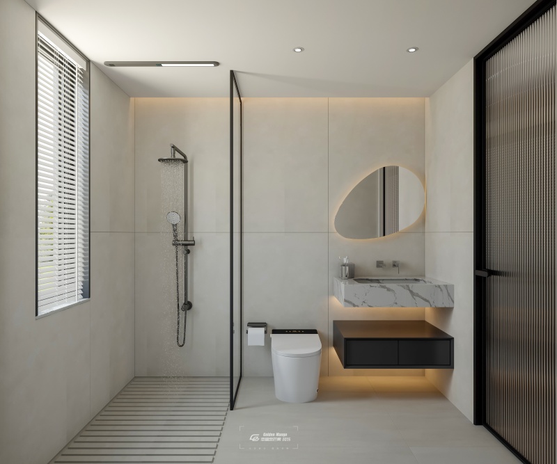 玻璃隔斷劃分淋浴區與干區,利落干脆。懸浮式洗手臺搭配大理石紋理臺面,橢圓鏡嵌入墻中,下方燈帶增添精致感。