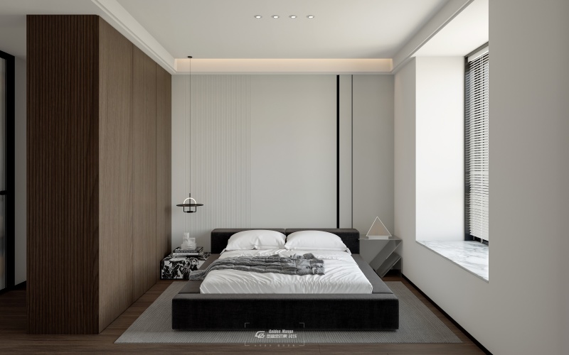 深灰床體與淺白墻面、床品形成對比,溫潤木質墻板增添自然質感,地面深淺搭配,層次豐富又不雜亂。
