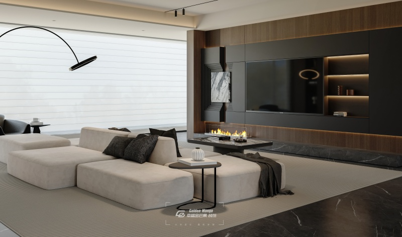 懸空電視柜與背景墻一體化設計,搭配內嵌式燈光,不僅滿足收納需求,更增添了幾分輕盈與高級感