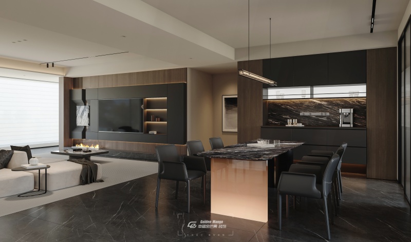 餐廳區域延續了客廳的簡約基調。黑色大理石餐桌搭配黑色餐椅,簡潔而高級。廚房島臺與餐桌功能區分明確又相互呼應,島臺上方的吊燈與餐桌上方的吊燈形成視覺上的連貫性。
