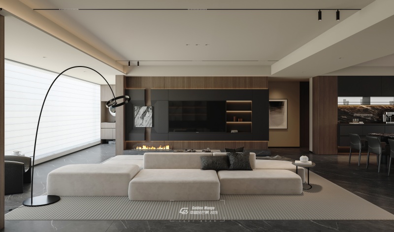 踏入客廳,便被其通透開闊的格局所震撼。墻面以黑、白、木三色為主基調,通過簡潔的線條與色塊劃分,勾勒出極具現代感的視覺效果。