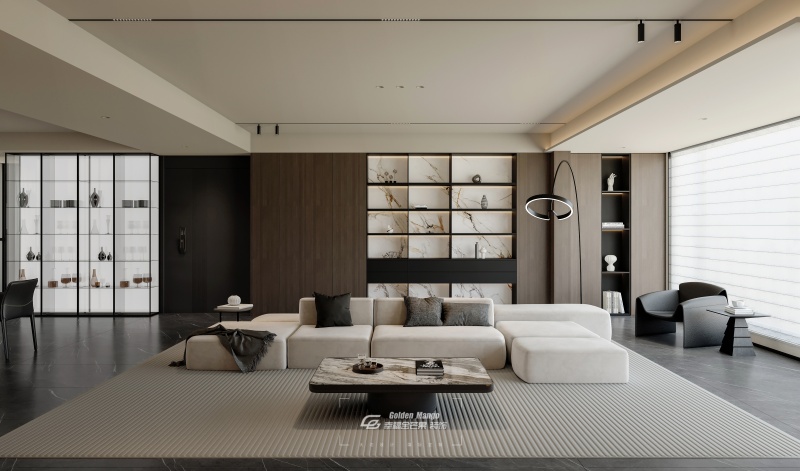 黑色地磚與灰色地毯的搭配,低調中透著奢華,而淺色沙發搭配不規則大理石茶幾,圍合出一個溫馨而時尚的交流空間。落地窗引入充足自然光,光影交織間,讓整個空間充滿生機與活力。