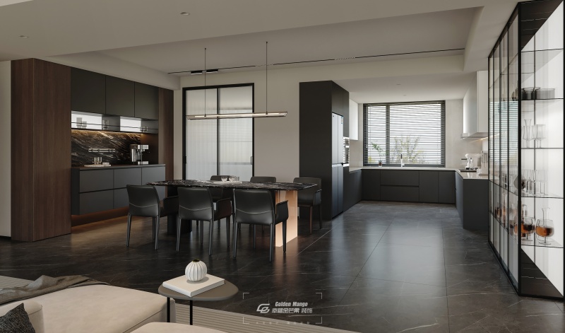 廚房區域以簡約而實用的設計為特點。整體櫥柜采用深色系搭配黑色大理石臺面,營造出一種低調奢華的氛圍。