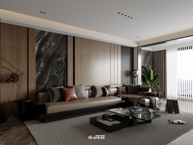 空間布局開闊流暢,沙發、茶幾等家具擺放規整,營造出舒適有序的氛圍 。墻面運用木質、石材等天然材質,搭配簡約的燈光設計,凸顯出意式極簡風格的優雅與質感,同時綠植點綴增添生機,讓整個空間兼具時尚與自然韻味 。