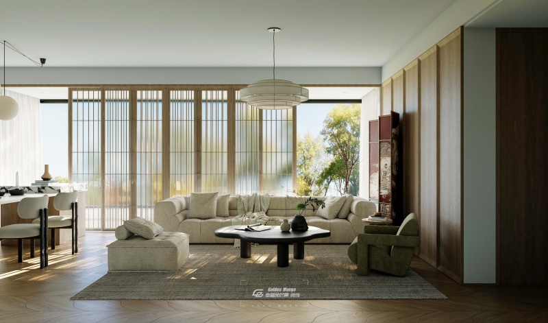 客廳,是這場夢的序章。淺米色的沙發如溫柔的云朵,慵懶地舒展著身姿,柔軟的觸感仿佛能包容下所有的疲憊。沙發上的幾抹綠意,是自然的信使,為這個空間注入生機與活力,它們在光影的舞動下,譜寫著生活的詩篇。