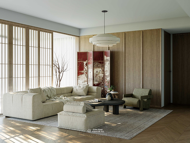 中古風的屏風靜靜佇立,紅與白交織的圖案,宛如一幅古老的畫卷,訴說著往昔的故事。它不僅是一道裝飾,更是一道時光的分界線,將現代的簡約與中古的韻味巧妙融合。陽光透過木質百葉窗,灑在淺灰色的地毯上,形成斑駁的光影,似是歲月在空間里留下的溫柔筆觸。