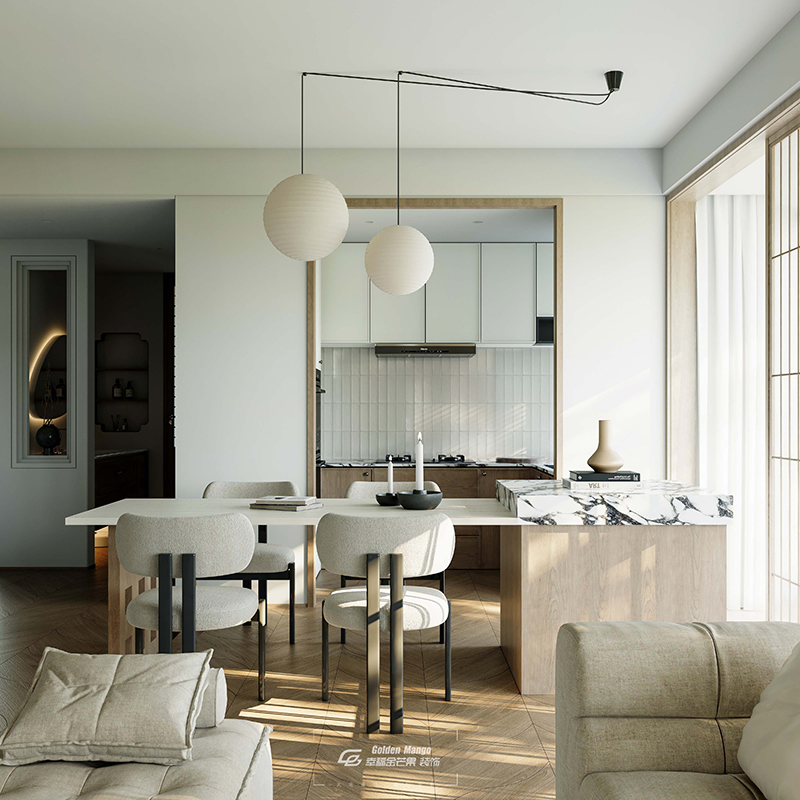 餐廳與廚房以開放之姿相連,模糊了界限,讓生活在這里流轉得更加自然。白色的餐桌搭配淺色座椅,簡約而不失格調。桌上的燭臺與綠植,在光影的映襯下,營造出浪漫而溫馨的用餐氛圍。
