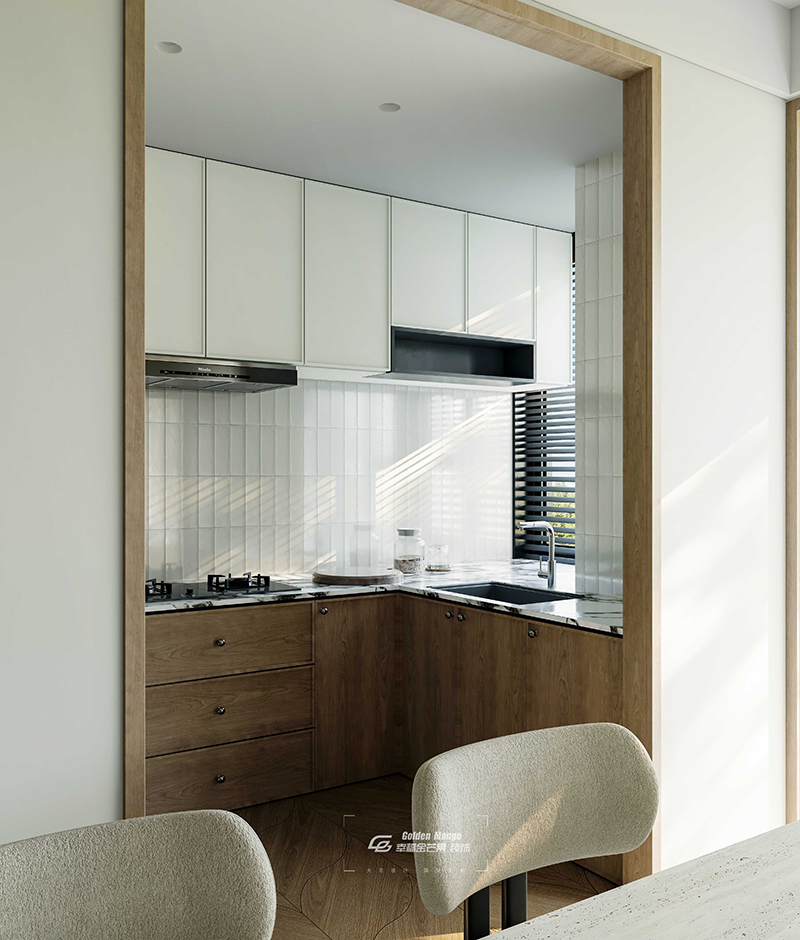 木質的櫥柜與白色的臺面相得益彰,既保留了自然的溫度,又彰顯出現代的潔凈。在這里,烹飪不再只是日常的瑣事,而是一場與美食的藝術邂逅。每一道工序,都在木質與白色的交織中,被賦予了生活的儀式感。
