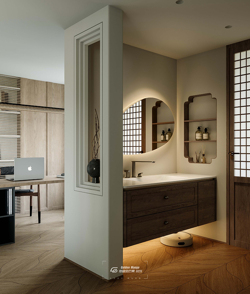 洗漱臺的設計,是這片空間里的精致注腳。中古風的木質收納柜,搭配現代簡約的洗漱臺,傳統與現代在這里和諧共生。