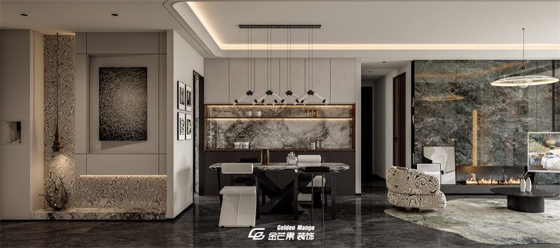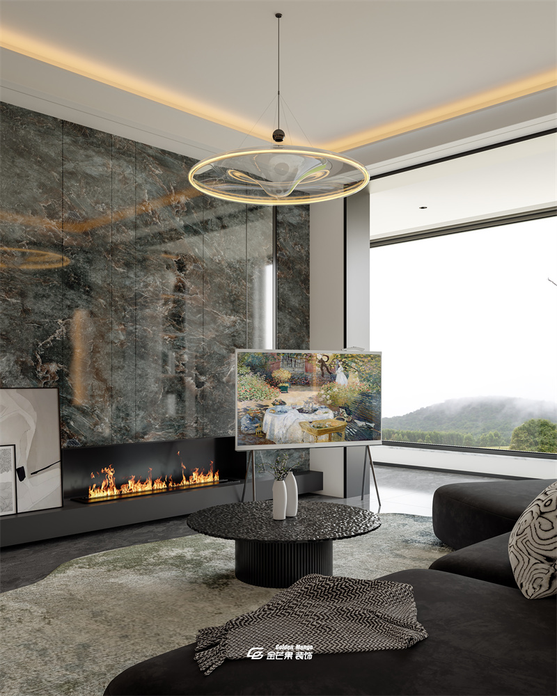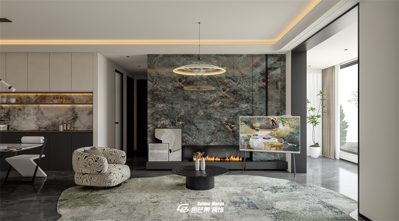 采用紋理獨特的深色大理石,自帶高級質感,下方的壁爐設計,火焰跳動增添了溫馨與氛圍感。