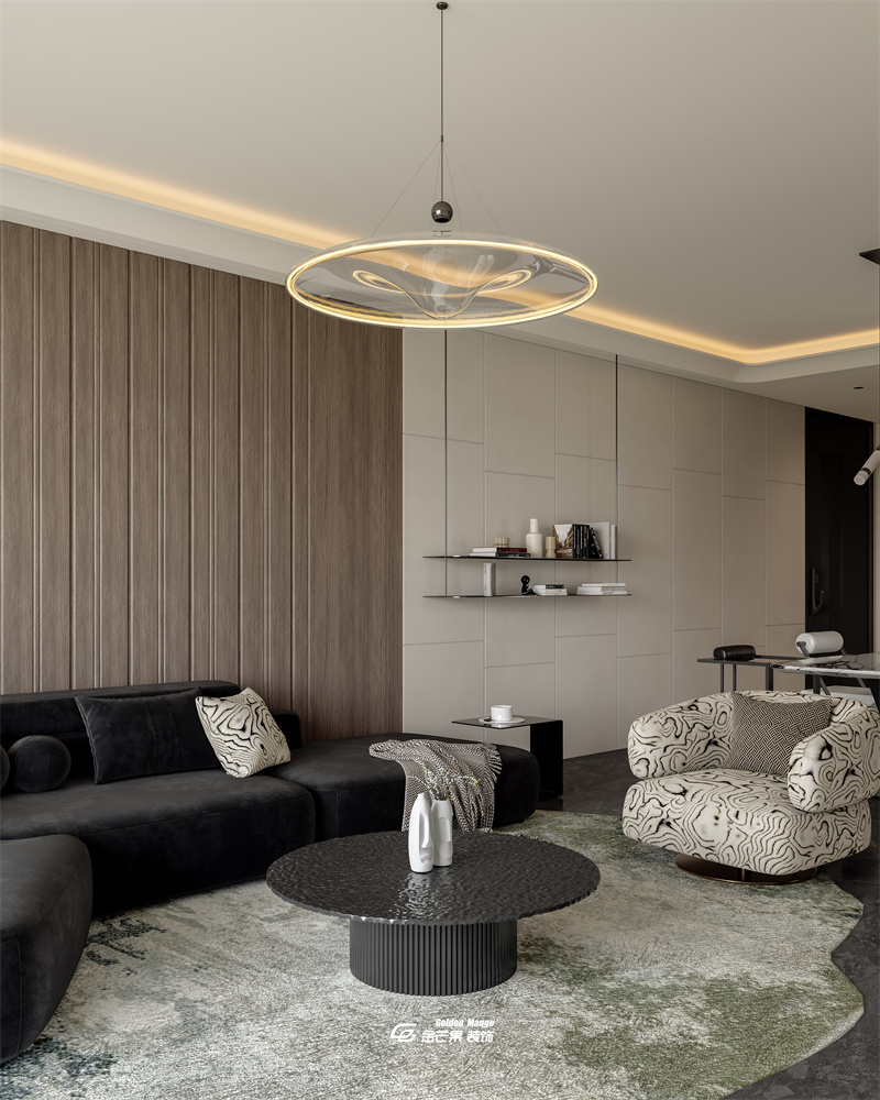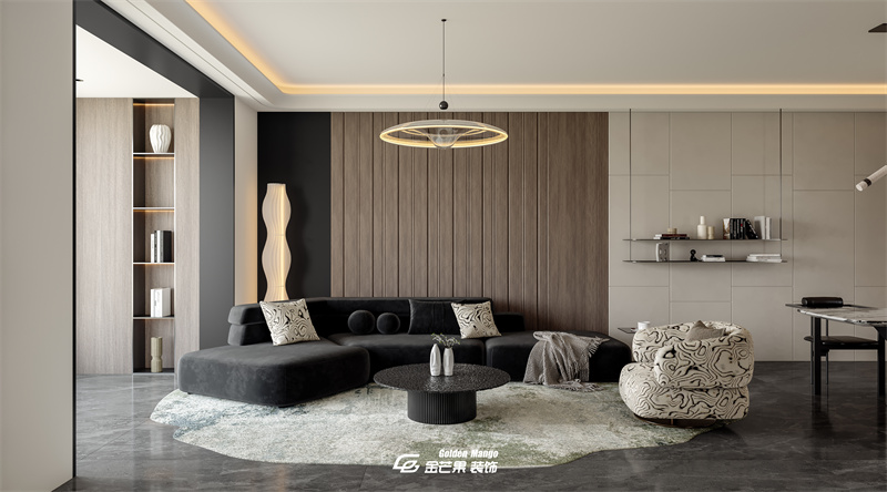 黑色的大尺寸沙發搭配帶有花紋的抱枕,時尚且舒適;旁邊造型獨特的單人椅,為空間增添了藝術感。背景墻采用木飾面與黑色板材拼接,層次豐富。上方懸掛的環形吊燈,造型別致,燈光柔和,提升了空間的溫馨感。