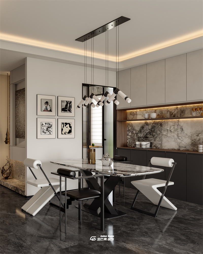 餐桌選用大理石紋理的桌面,搭配黑色的 “X” 形支架,時尚又穩固。周圍的椅子設計獨特,黑白配色簡潔利落,造型別致,為空間增添了藝術感。
