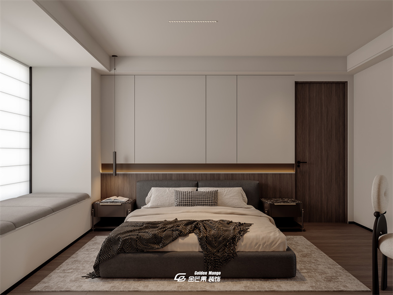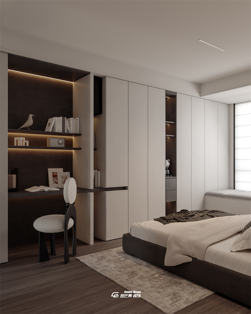 主臥衣柜采用了一體化的設計,以淺色調為主,與整體空間的現代簡約風格相契合。衣柜為嵌入式,很好地利用了墻面空間,顯得簡潔利落。