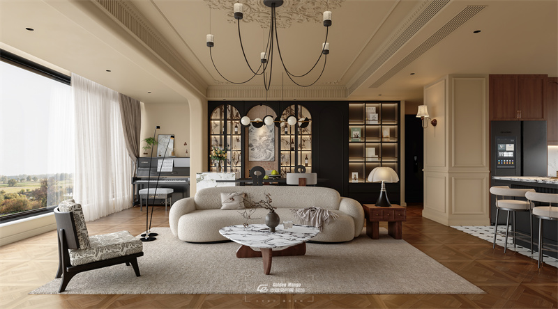 淺米色墻面搭配精致雕花,營造優雅基調。拱門造型與復古吊燈,增添浪漫氛圍,弧形沙發、藝術茶幾柔化線條,鋼琴與酒柜區域,融合藝術與生活,大窗引入自然光線,整體呈現出浪漫、精致且舒適的法式居住氛圍 。