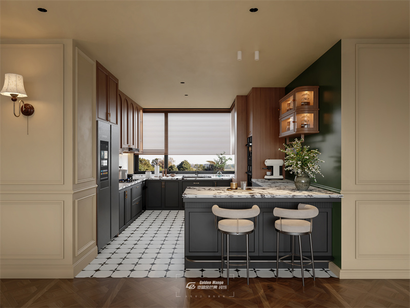 以米色護墻搭配墨綠色墻面,營造優雅復古氛圍。深色櫥柜與大理石吧臺質感十足,吧椅簡約時尚,墻面壁燈、木質吊柜增添細節溫度。大窗引入自然光線,窗外景色延展空間,人字拼地板與花磚地面豐富層次,整體呈現出兼具經典韻味與實用功能的烹飪休閑場景 。