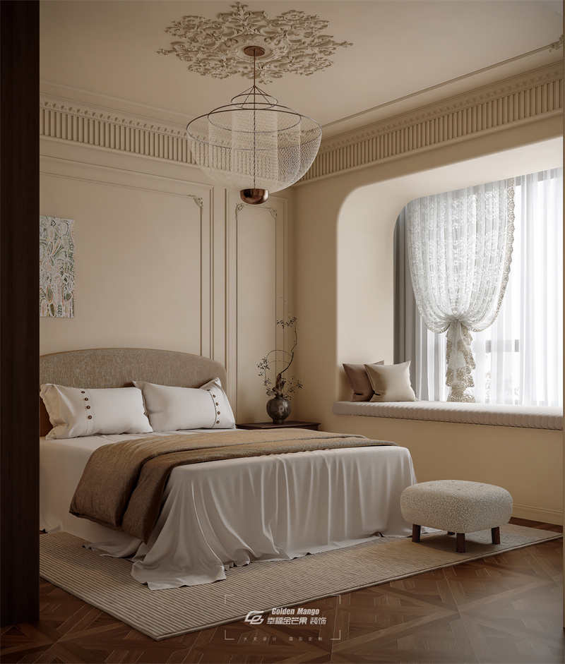 柔和米色為主調,雕花吊頂、石膏線護墻勾勒優雅輪廓。木質百葉衣柜兼具收納與美觀,復古吊燈、藝術掛畫增添氛圍,窗邊打造愜意飄窗,床品、家具選品溫潤,整體營造出浪漫經典又舒適靜謐的休憩環境 。