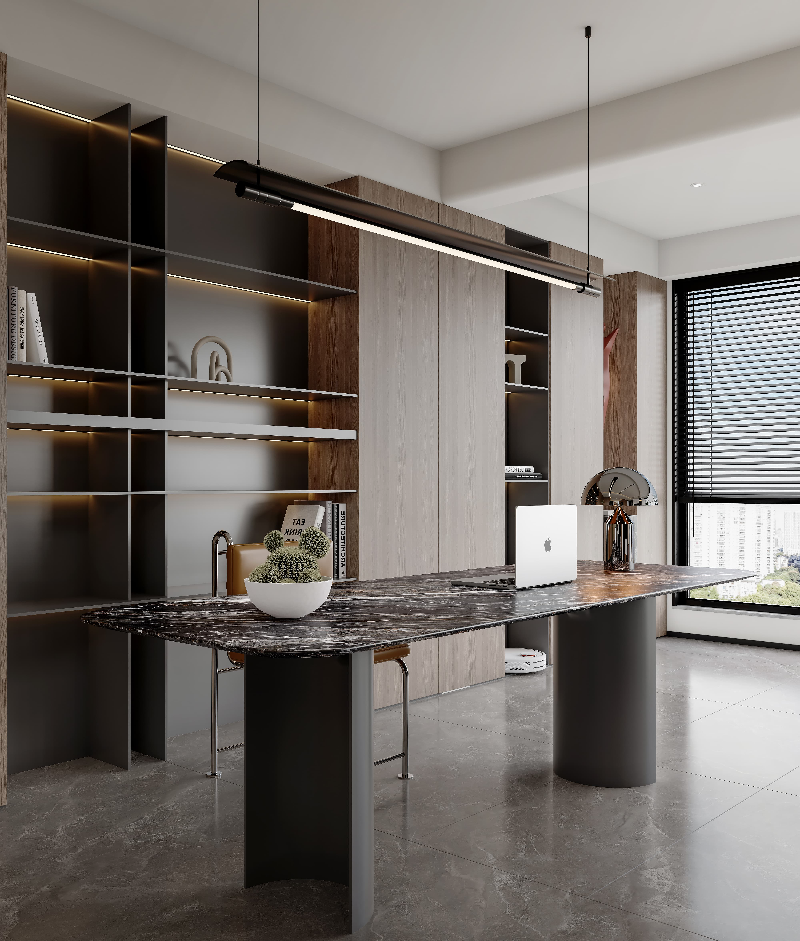 家具陳設(shè):房間中央擺放著一張?jiān)煨酮?dú)特的書桌,桌面采用大理石材質(zhì),紋理自然,質(zhì)感高級(jí);桌腿則是深色柱狀設(shè)計(jì),與桌面形成對(duì)比。