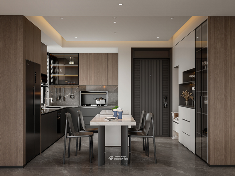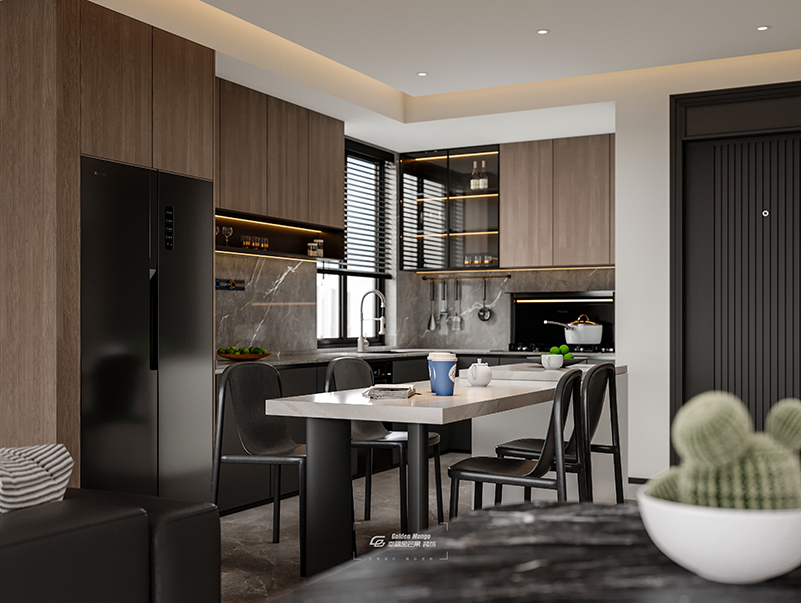 餐廚一體的空間設(shè)計(jì),打破傳統(tǒng)界限,讓烹飪與用餐不再只是單一的生理需求,而成為一種充滿煙火氣的生活享受?,F(xiàn)代簡(jiǎn)約風(fēng)格的餐桌椅,線條流暢,質(zhì)感十足。四把胡桃木餐椅環(huán)繞著大理石臺(tái)面餐桌,低調(diào)中透露著奢華。清晨,陽(yáng)光透過(guò)廚房的窗戶灑在餐桌上,為一頓豐盛的早餐增添了幾分溫暖與活力。