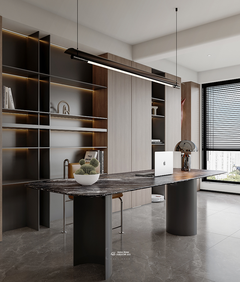 穿過(guò)客廳,便是書房,這個(gè)靜謐的空間里藏著主人追尋夢(mèng)想的足跡。大幅落地窗,讓自然光毫無(wú)保留地傾灑進(jìn)來(lái),白日里,你可以伴著陽(yáng)光閱讀、寫作、思考。夜晚降臨,打開書房?jī)?nèi)隱藏的燈帶,柔和的光暈籠罩整個(gè)空間,營(yíng)造出專注而寧?kù)o的氛圍。木質(zhì)書架、玻璃隔斷、開放式置物架,設(shè)計(jì)多樣,卻和諧統(tǒng)一。書籍、擺件、綠植,錯(cuò)落有致地?cái)[放其中,每一處細(xì)節(jié)都彰顯出主人的品味與格調(diào)。