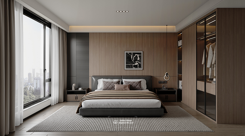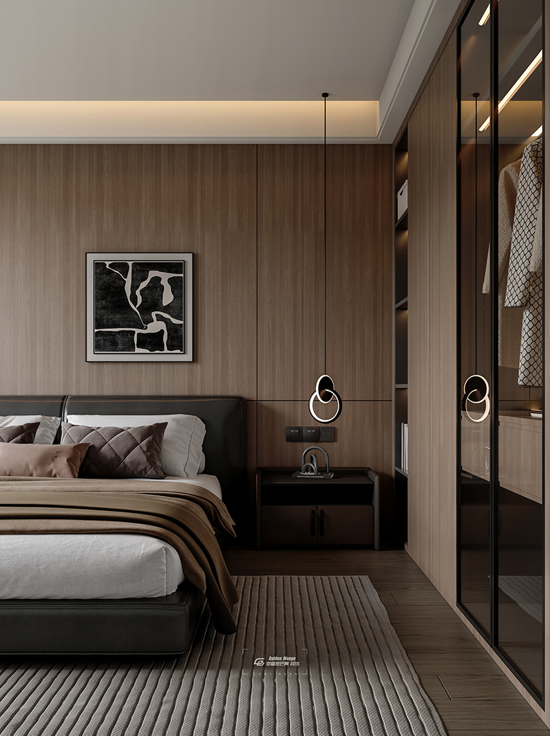 主臥,宛如一個(gè)溫暖的懷抱,靜靜等候著疲憊的你歸來(lái)。大面寬的窗戶,將窗外的景色毫無(wú)保留地引入室內(nèi),無(wú)論是清晨的第一縷陽(yáng)光,還是夜晚的點(diǎn)點(diǎn)繁星,都成為臥室里不可或缺的風(fēng)景。床頭背景墻采用木質(zhì)板飾面,搭配線條燈帶,營(yíng)造出自然且富有層次感的氛圍。床頭兩側(cè)的圓形吊燈,線條簡(jiǎn)潔,卻又散發(fā)著柔和的光芒,為臥室增添了幾分溫馨與浪漫。