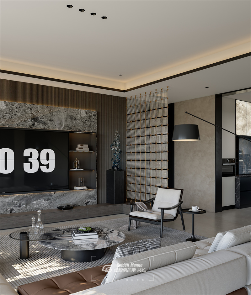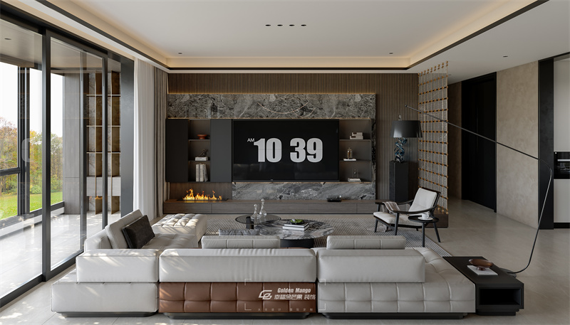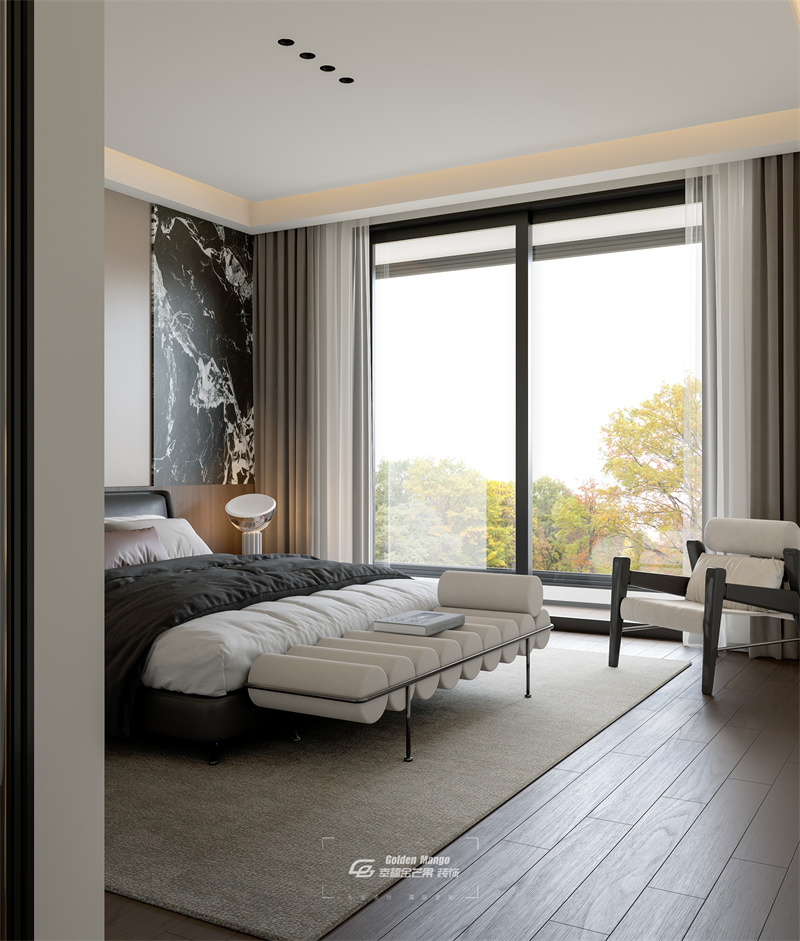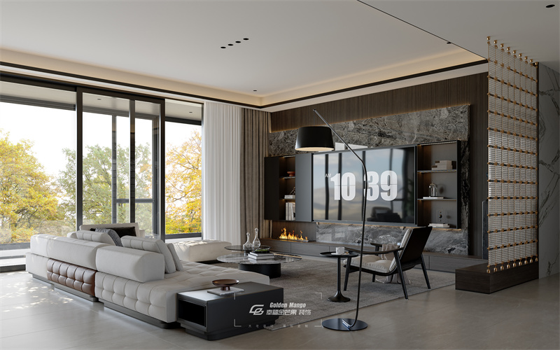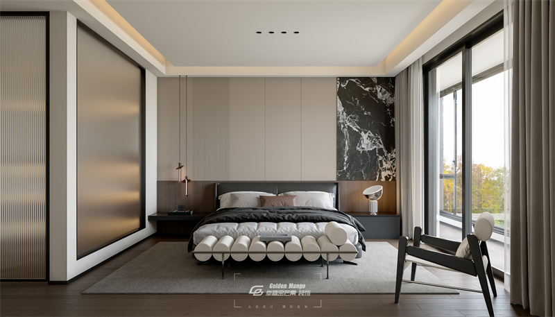 墻面部分采用帶有紋理的板材與大理石裝飾畫,層次分明且質感卓然。大面積的落地窗引入充足自然光線,讓室內通透敞亮,窗外的景色也成為空間的一部分,進一步提升了居住的愜意感。