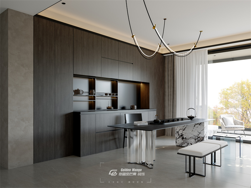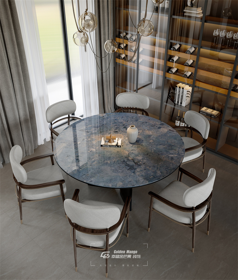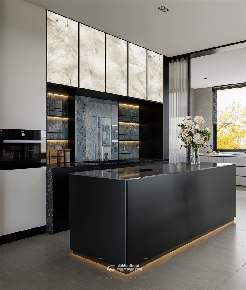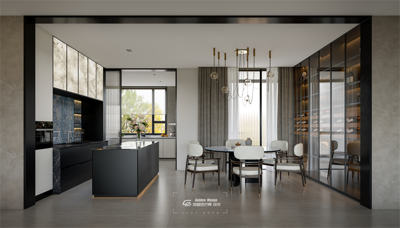 整體設計簡約大氣,廚房以黑白為主色調,深色中島臺搭配帶有大理石紋理的墻面與柜體,簡潔又富有質感,嵌入式電器與合理的收納布局,兼顧美觀與實用;餐廳區域,圓形大理石餐桌質感卓然,搭配淺色系座椅,溫馨又舒適,一旁的玻璃酒柜陳列有序,增添了空間的格調,上方造型獨特的吊燈更添藝術氛圍。