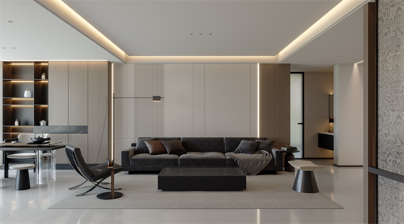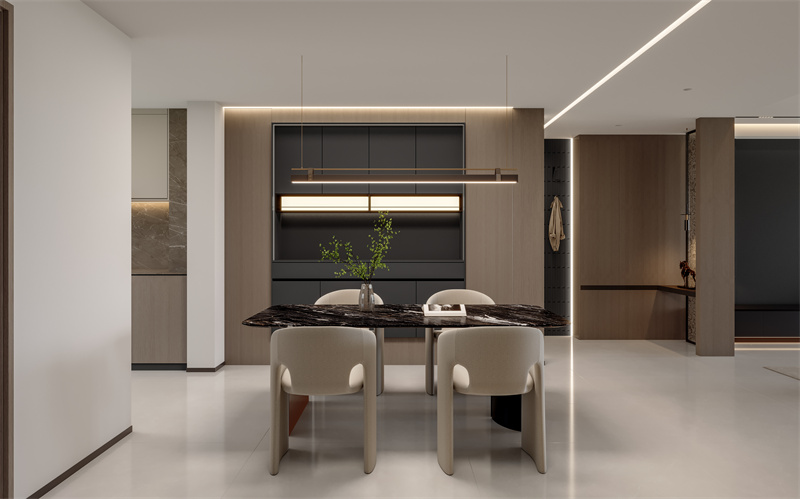 作為 245㎡大平層的核心場域,客廳以 “少即是多” 的內核,演繹意式極簡的精髓。沒有冗余裝飾,僅用淺灰色絨面沙發搭配啞光黑懸浮茶幾,奠定冷靜雅致的基調;淺木色墻板與白色巖板背景墻碰撞,在材質對比中透出細膩質感。懸浮吊頂嵌入線性暖光,弱化空間邊界的同時,給硬朗線條裹上一層柔光,隱形收納墻藏起生活瑣碎,只留開闊通透的場域 —— 在這里,窩在沙發追劇、與家人閑談,每一刻都是被質感包裹的松弛。
