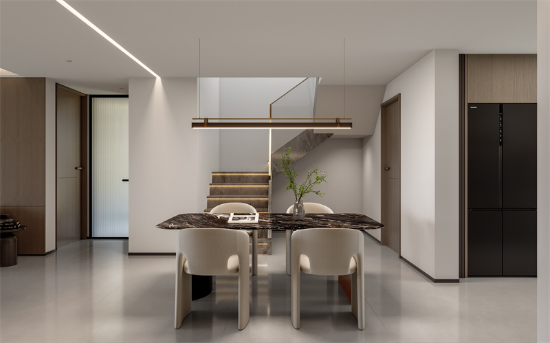 紫東苑這套案例,沒有堆砌的裝飾,卻讓每一處都自帶 “高級濾鏡”:淺木色墻板與啞光黑柜面撞出冷靜的質感,懸浮吊頂里的線性光像給空間裹了層柔光濾鏡,連沙發的絨面、茶幾的冷硬都在材質碰撞里,透出松弛的精致。客廳的隱形收納墻藏起生活瑣碎,餐廳的大理石桌與懸浮樓梯剛柔并濟,廚房的極簡柜面把煙火氣藏進秩序里 —— 意式極簡從不是 “空”,是把每一分空間都留給 “舒適”,讓家既是美學展廳,也是能光著腳踩在地板上的松弛場。