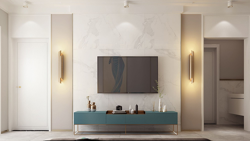 電視背景墻以帶有紋理的白色大理石為背景經久耐看,兩邊的燈飾加上大理石顯現出高端而優雅,電視柜側重表現北歐元素,簡潔大方、實用而美觀。